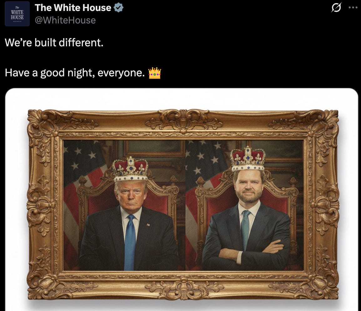 There is no doubt that this plays to Trump’s base, and serves their common purpose of “owning the libtards” who necessarily react to this (literal) crap. It also confirms that Trump is aware of, and affected by, the protest and; if the left is telling him he can’t be a king then by golly he’d better portray himself as a king. His team is also laying the groundwork for the public to accept and expect Vance to eventually take the crown.
