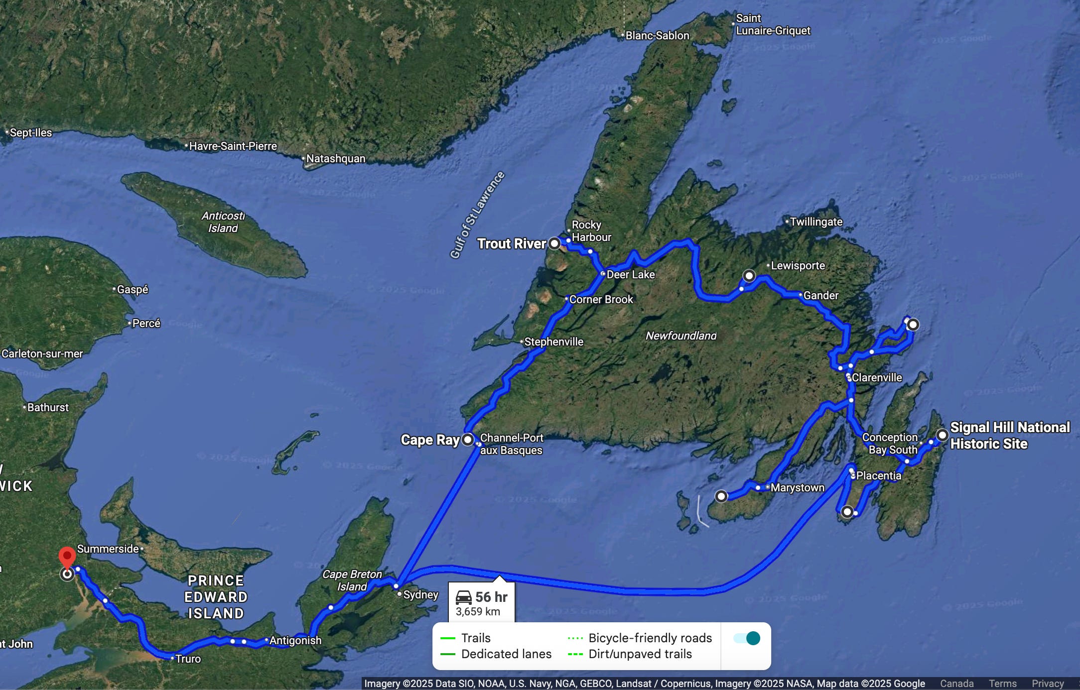 Wednesday morning we left at sunrise, stopping briefly at Wreckhouse, a patch of land known for having winds so strong they regularly blow trucks over, and then the lighthouse at Cape Ray, on our way to Port-aux-Basques to catch the Blue Puttees ferry back to North Sydney. We slept that night in Sydney before making the final push home Thursday. With a two year old in the car, driving over five hours a day is challenging!