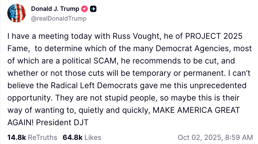 Shutting down the US government is not by accident and no amount of offers other than full capitulation by the Democrats will change Project 2025’s objectives for their country.
