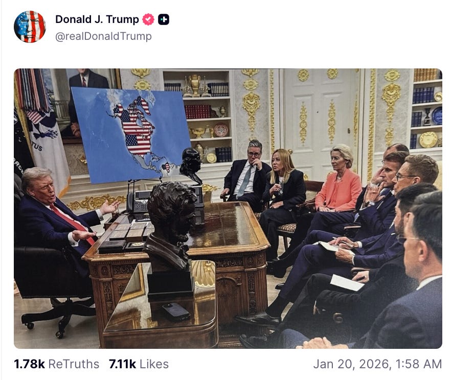 Then, this morning, he doubled down with this picture he posted on his own social media: Canada, Greenland, and Venezuela as conquered American territory being presented to 8 European leaders.